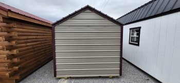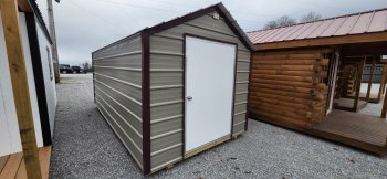 New Metal Economy Barn. Clay with burgundy roof and trim.
