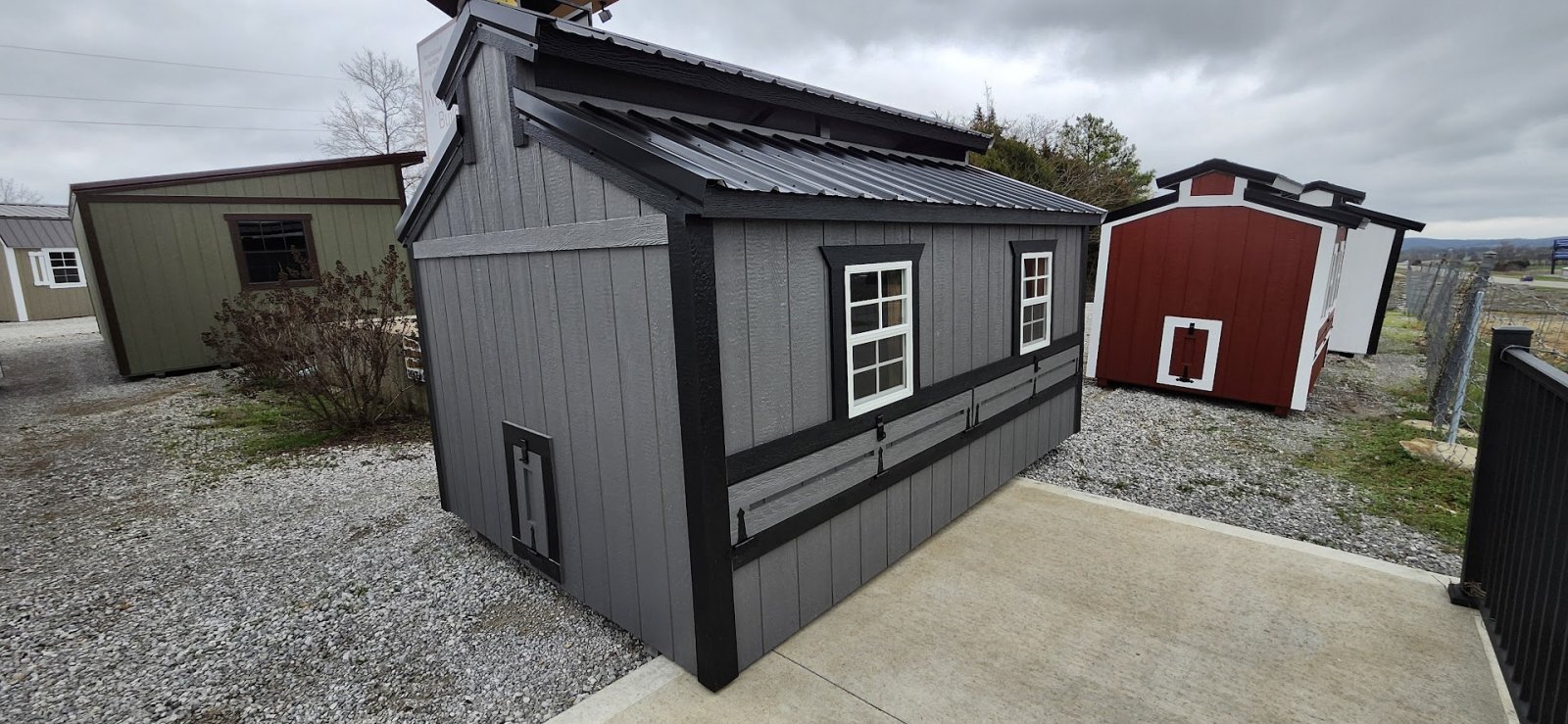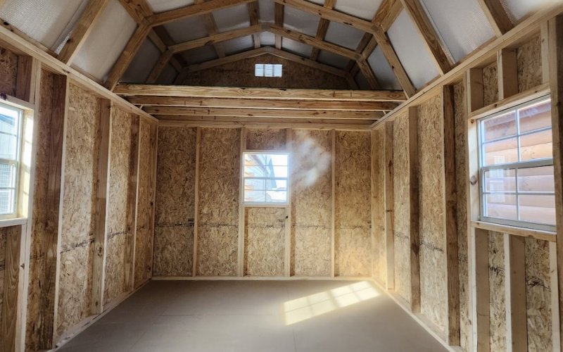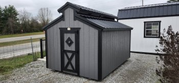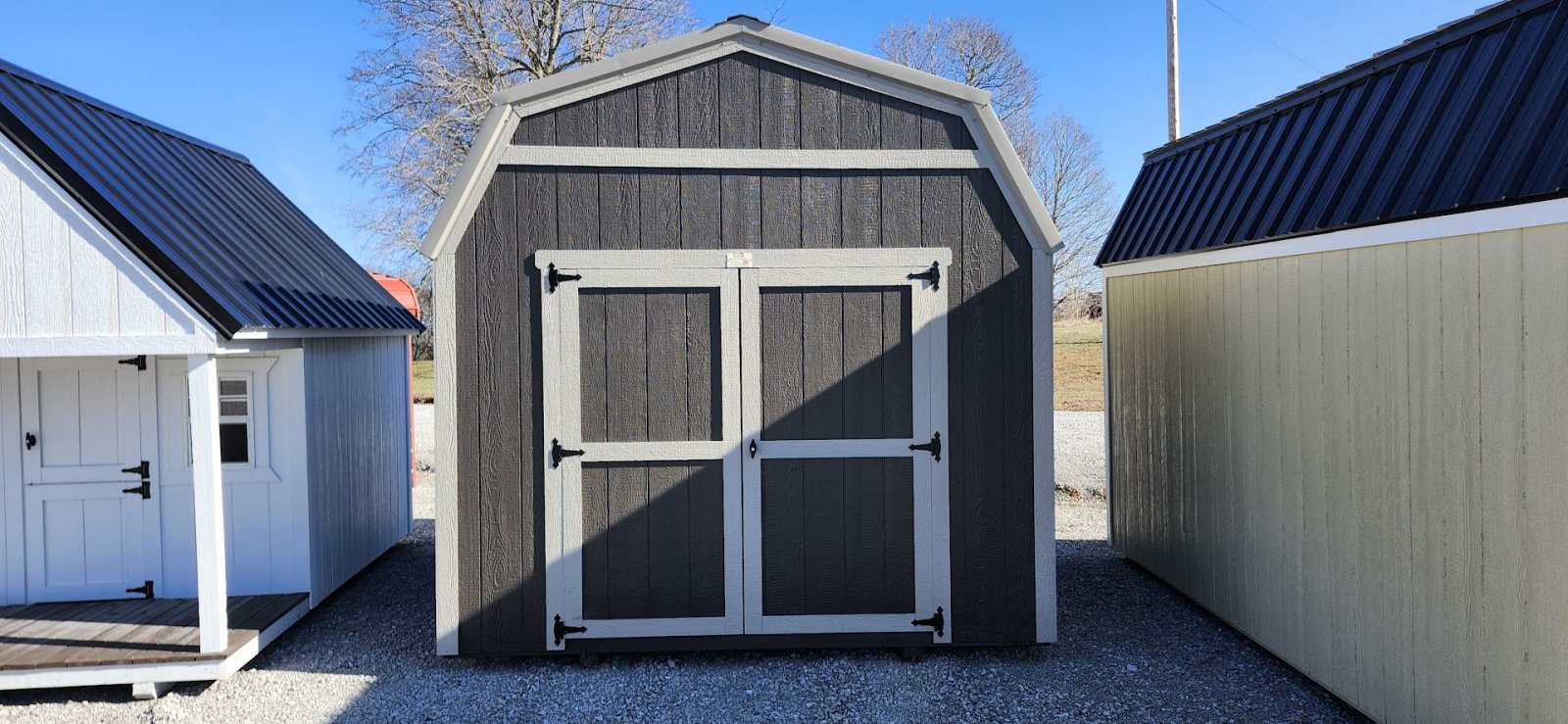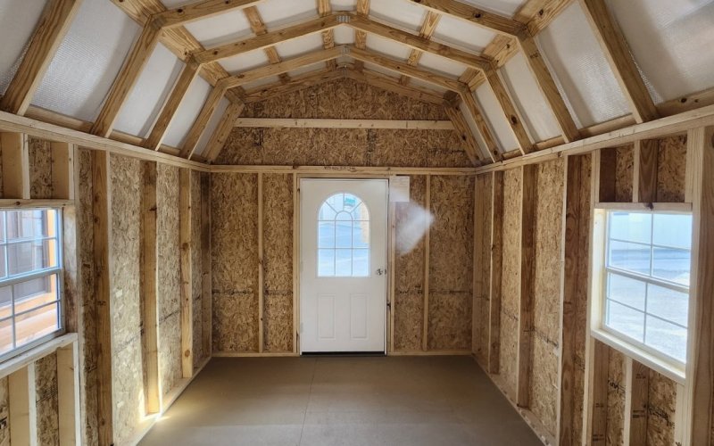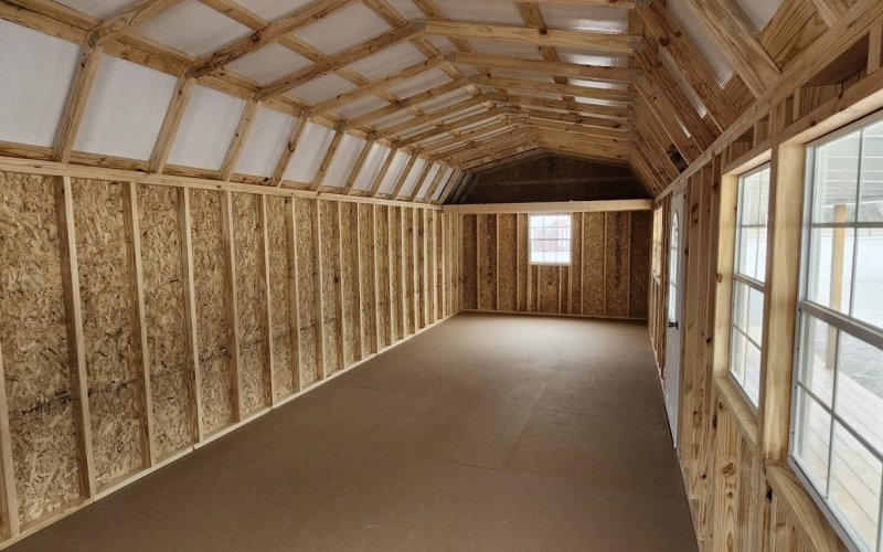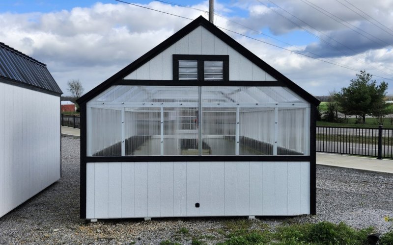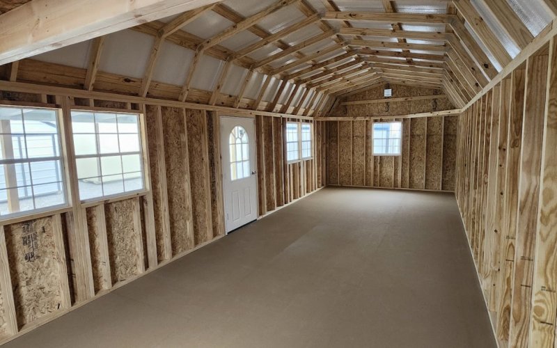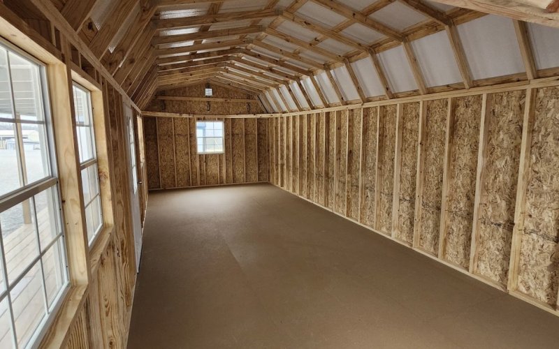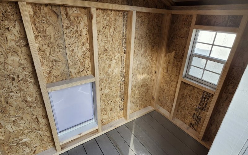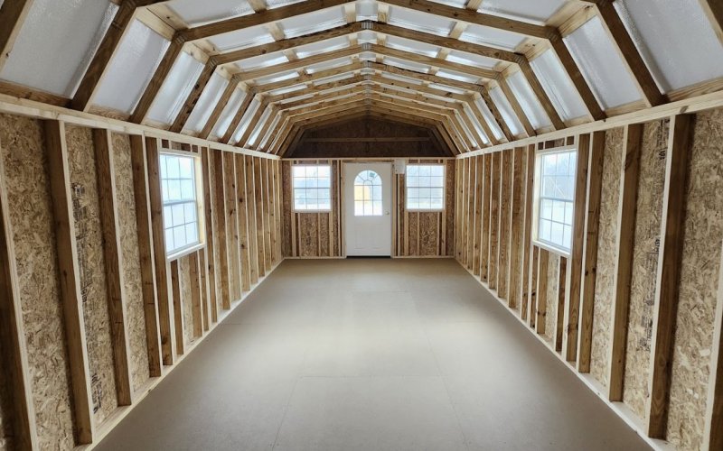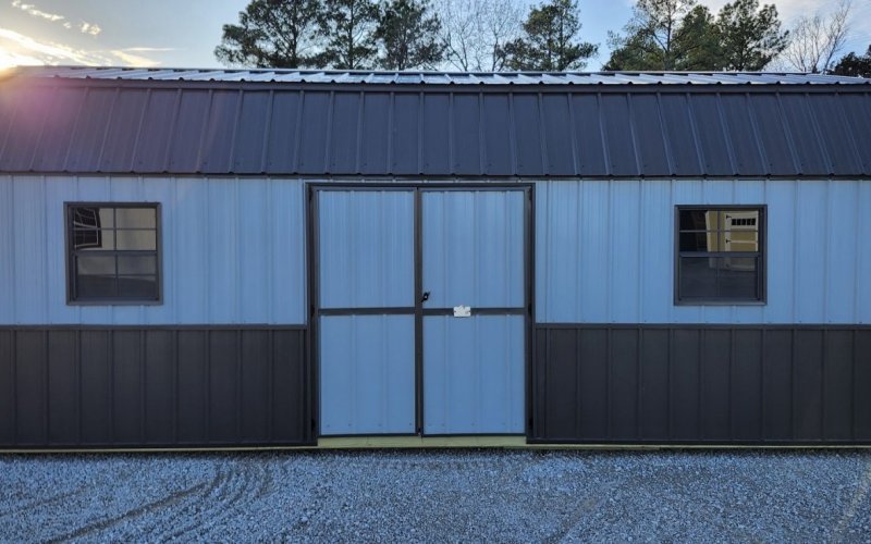 72" Double doors with transom windows Painted trim option Shelves 2' wide Shutters 2- Medium windows 3- Transom windows